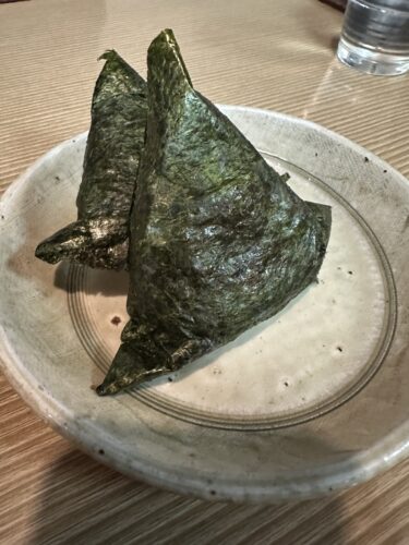 そしてもう一つおむすびも一皿お願いしました。このおむすびがほんと美味しんですよね~!しっかりした焼き海苔がたまらないです。一つは梅、一つは昆布になっています。一つずつでも頼めますよ。