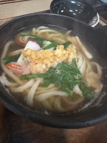 そこへまずは鍋焼きうどんが登場しました!海老天が入っています!いい香りがしますね~!あつあつでとっても美味しそう!
