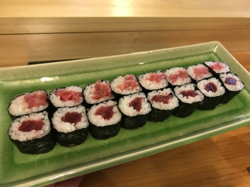 ここで少し巻物が食べたくなってしまって、、無理言ってトロ巻きと鉄火巻きを作ってもらうことに!あらたさんの海苔は本当に最高ですからね~!風味がまったく違いますよ!マグロももちろんおいしいんですが私はこの海苔に心奪われています!