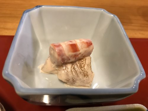 まずは先付から!もう数の子は飽きたんじゃないですか~ということで少し変わり種を!マヨネーズに数の子があうあう!車海老もぷりっぷりで超おいしいです!