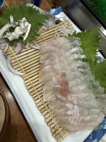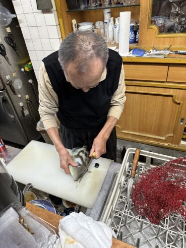 お店に入ると生け簀に立派なウマヅラハギたちが!お父さんがその場でさばいてくださいます。
