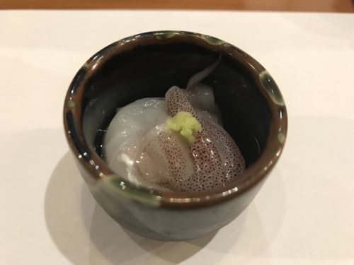 まずは生ビールで乾杯!久々のお店での再開を祝して!最初の先付はイカのマリネ。わさびがきいていてとってもおいしい~!
