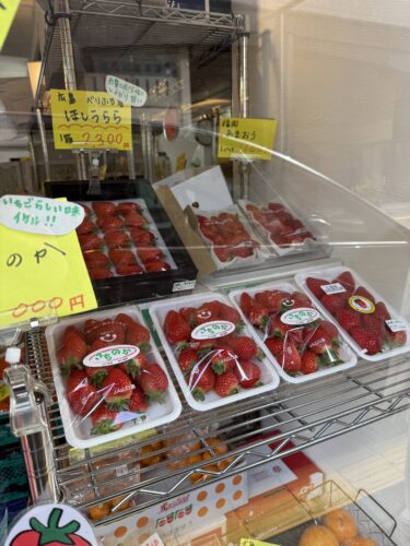 出来上がるのを待っている間に他の果物をみていると美味しそうなイチゴが!こういう専門店のいちごってほんと美味しそう!実際においしんですけどね!