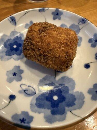 すると油で揚げる音が!なんとお母さんがコロッケを作ってくださいました。注文するまでもないですね(笑)。絶対にお願いするんですからね~。この手作りコロッケがほっくほくでこれまた美味しんです。訪れた方はだいたい頼まれるのかな~。ウスターソースでいただきます!