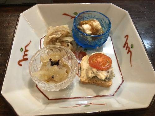 美味しい生ビールをいただきながらこの日のメニューを見てみるとイチボがありました!これは食べないと~!先付をいただきながらいろいろとお願いしました!この日の先付もとってもおいしいです~!生ビールがとまりませんね~!
