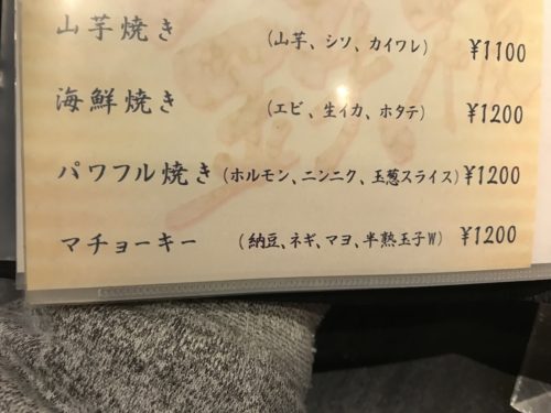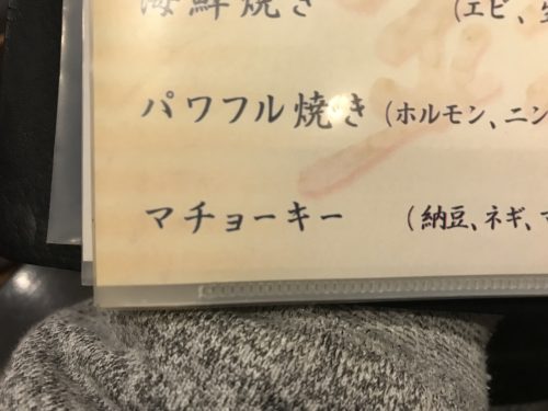 ん?何?指さされたところを見てみると、、IMAXと同じく聞いたことがない言葉が、、、マチョーキー?マチョーキー?まったくわかりません。見当がつかないです!お好み焼きのメニューの一つなのはわかるんですが、、、