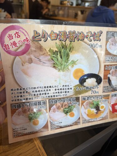 お店に入るときっちり2名席が空いていました!ラッキー!メニューの中からとり白湯醤油そばをお願いしました!もちろん一緒にちょい飯もセットで!麺を食べた後にスープをごはんと一緒にいただくのが最高なんですよね~!