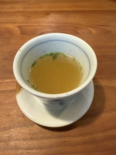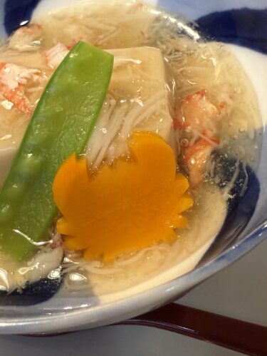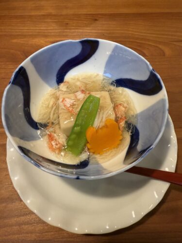 続いて手作り胡麻豆腐の蟹葛餡が登場しました!たっぷり餡がかかっていますので注意しながらいただいてみるとこちらも美味しい~!胡麻豆腐の風味がいいですね~!