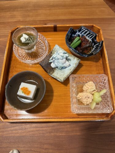 続いて前菜の盛り合わせが登場しました!美味しそう!タコの旨煮最高でした!じゅんさいとモズクも美味しい~!白和えも素晴らしい~!いや~美味しいです~!