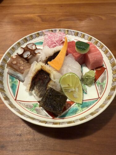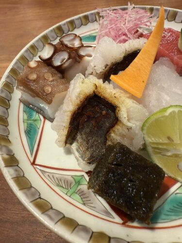 お造りで登場したのは山口は大島で活〆されたハモ、地元倉橋で獲れたタコ、そして本マグロの中トロでした!まずは鱧から~!香ばしさがたまらない~!