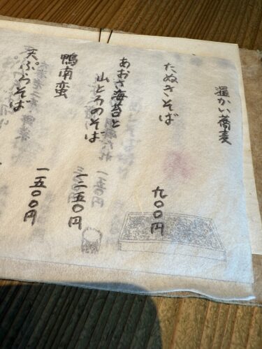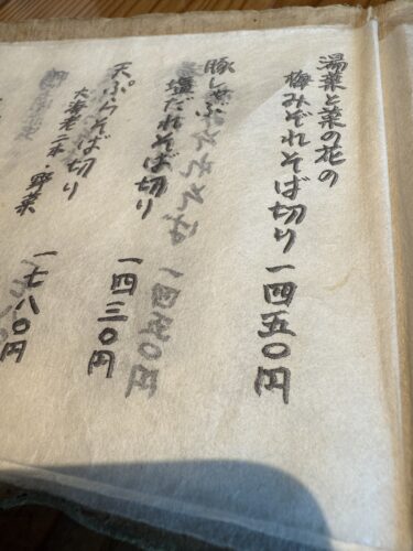メニューを見ながら私は温かいたぬき蕎麦にしました。なんかここ数年、お出汁が飲みたくなりまして。ご一緒した方はしらすの冷たいお蕎麦にされていました。お願いする際にごはんをサービスしてくださるとのことでこの日はタケノコごはんだと。たけのこごはんがサービスしてもらえるなんて!びっくりしました!