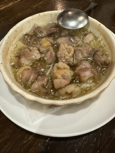 続いて親鳥のアヒージョが登場しました!いや~美味しい~!歯ごたえたまらんですね!食べ終わったらこのオイルにパンを浸していただきます。最高!