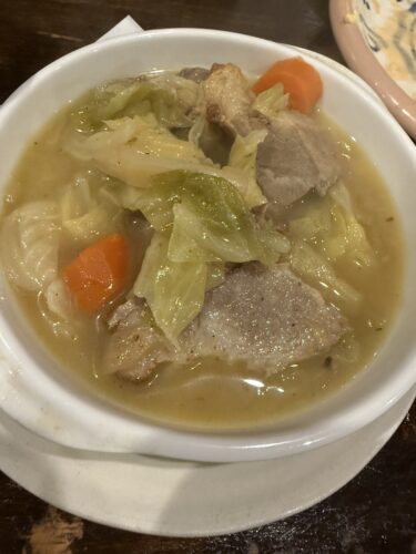 栗豚肩ロースのキャベツの蒸し煮も大きな肩ロースがたっぷりと!いただいてみると柔らかくてとっても食べやすい~!スープにはたっぷりうまみがでているのでこちらもパンを浸して根こそぎいただきますよ~!