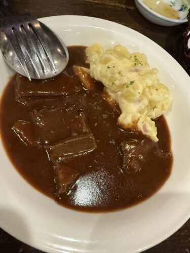 今日のおすすめ料理になっていたほほ肉の煮込みをお願いしました!フォークじゃなくてスプーンでほほ肉をすくっていただきます。ほろほろですからね~!これまためちゃめちゃ美味しい~!添えてあったじゃがいももめちゃうまです!