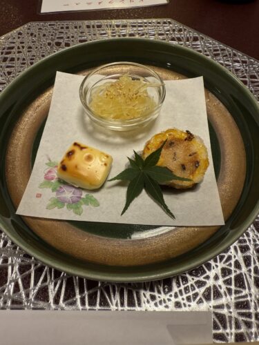 この日は人数が多かったので2階の座敷に案内いただきました。揃ったら乾杯です!先付はそうめん瓜と麩のチーズのせ、そしてしんじょうのまわりをトウモロコシで巻いて揚げたものです。手がこんでいますね~!そうめん瓜大好きなんですよ~!美味しい~!