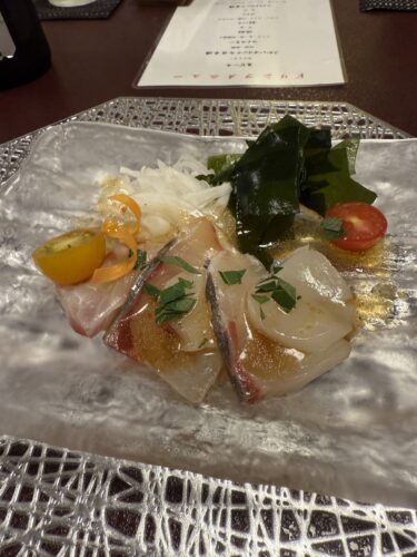 お造りはカルパッチョ風で登場しました!この暑い季節にはあっさりいただけてもってこいですね~。季節感を感じられるお皿もいいですね!