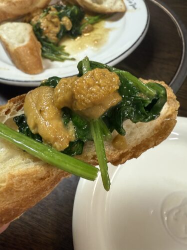 このウニホウレンが中ちゃんの名物料理でもあります!パンにウニとほうれん草をたっぷりのせていただきます!もう最高!最後の一滴までパンですくいとっていただきました~!