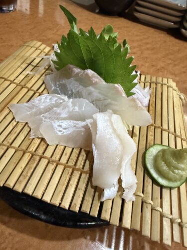 まずはヒラメのお刺身からいただきましょう!立派なひらめですね~!めっちゃ美味しそう~!最高じゃないですか!甘みがしっかり感じられる美味しいヒラメです~!