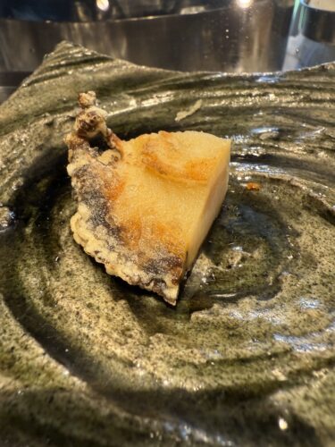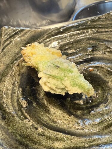 あわびの肝が登場しました!天ぷらでいただくのはこちらも初めてですね!お酒がのみたくなる美味しさです!