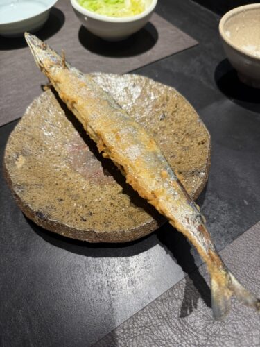 そこに先ほどの今年初物のさんまが登場しました!こうして一本まるごと揚げてあるさんまは初めてみました!