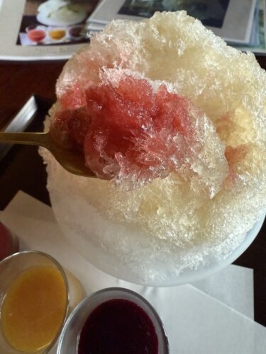 続いて果実氷が登場しました!3種類の風味と練乳と蜜の合計5種類が味わえました。まずは少しずつ垂らしていきます。この日はいちご、柑橘、ブルーベリーでした。まずはいちごからいただきます。