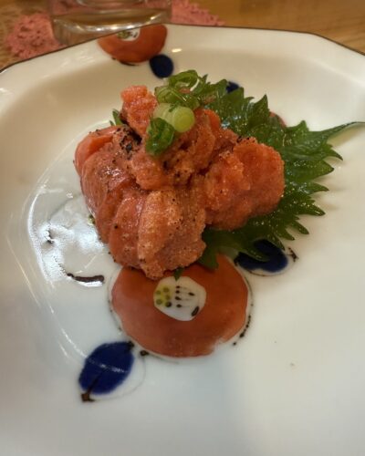 前回とっても美味しかった明太子の炙りもお願いしました。たっぷり盛ってくださいました!麦のソーダ割に変更して一緒にいただきます。美味しい~!