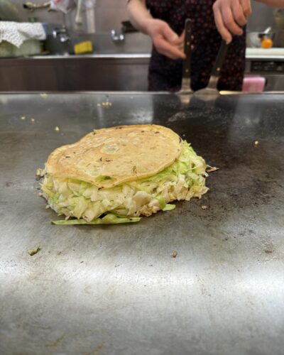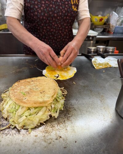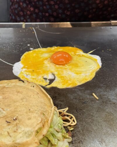 そしていつものように卵はダブルで!一つ鉄板の上で焼き上げたらその上に生卵をもう一つ投入!そしてすかさずお好み焼きを上から!これで半熟卵のお好み焼きの出来上がりなんです!