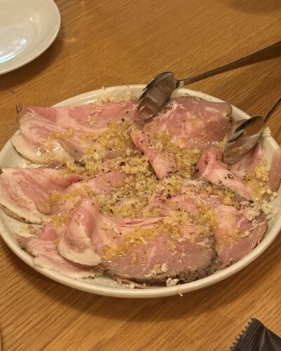 続いて広島の瀬戸もみじ豚の自家製ハムを西洋わさびでいただきます。ボリューム満点でとっても美味しそう!いただいてみるととってもまろやかな口当たりでめっちゃめちゃ美味しい~!西洋わさびもいいですね~!脂の部分がとっても甘くて口の中でとろけていきます。
