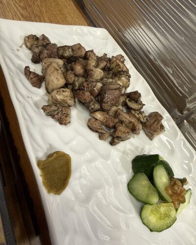 地頭鶏のもも焼きをお願いしました。とってもこうばしくて食欲をそそります。いただいてみると噛み応えがあってとっても美味しい~!いや~最高ですね~!