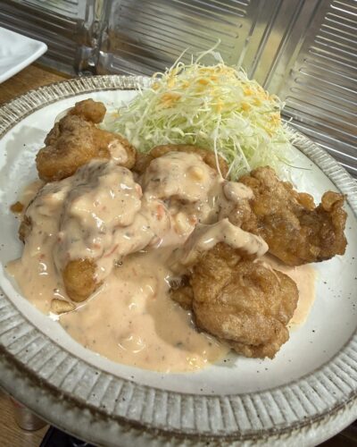 そして大好物のチキン南蛮が登場しました!唐揚げ風に揚げた鶏肉を南蛮漬けにして上からたっぷりとタルタルソースをかけてくださいます。これがとっても柔らかくて食べやすくてめちゃくちゃ美味しいんですよ~!ほんと最高です!たまげる美味しさですよ!