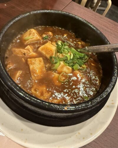 続いてマーボー豆腐をいただきます!出来立てアツアツなのでやけどに注意しながらいただきます!めっちゃ美味しい~!最高ですね~!