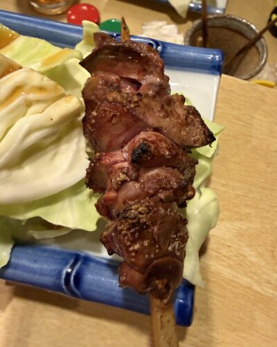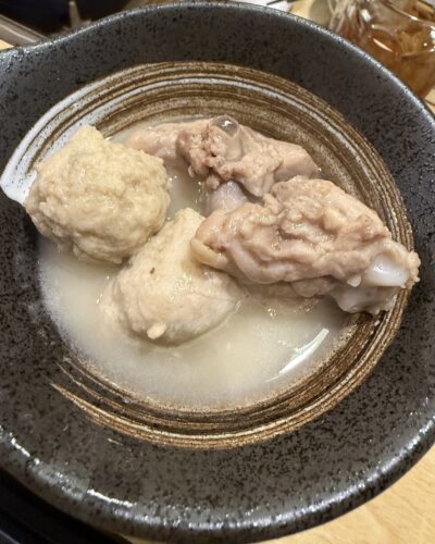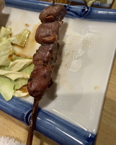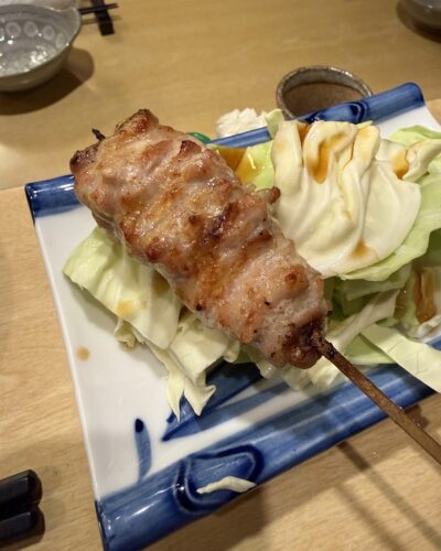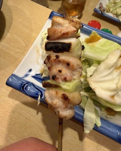 お鍋をいただきながら串もいただいていきますよ~!まずはせせりからいただきます!いつも通りジューシーで美味しい~!みのわさんのクオリティが当たり前じゃないことが違うお店にいったらわかりますね。その話をしていると