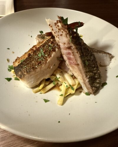 ウメイロの鉄板焼きをお願いしました。ウメイロって私はここ最近食べていますが最近はやりなんですかね~。バスク地方の伝統的な食べ方なんだそうです。4人で訪れたのですがちゃんと4分割してくださっていました。こういう気遣いもうれしいですね~。いただいてみると、めっちゃ美味しい~!ガーリックの風味がほどよいですね~。お魚自体も弾力があってとってもおいしかった~!