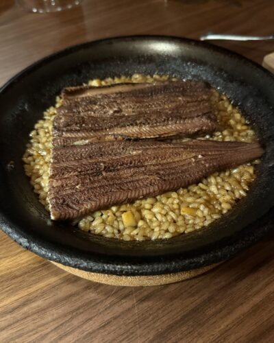 これまた一緒にワインを合わせていただきます。パエリアとワインてよくあうんですね~!続いてアナゴのパエリアが登場しました。アナゴがしっかり入っていました。まずはアナゴを少しだけいただいてみます。ふっくらしあがっていますね~!こちらも美味しい~!