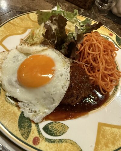 しかもナポリタンも添えてありました!さらに半熟目玉焼きも!お子様ランチ的な感じがいいですね~!ということで私も一口いただいてみました!めちゃくちゃ美味しい~!このねっとりした感じがたまらないですね~!