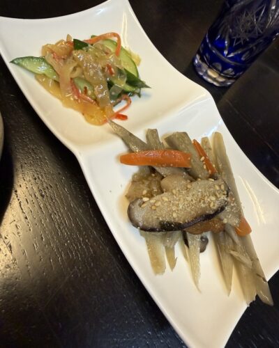 生ビールの樽をお願いしたら後のお酒は持ち込み放題なんですって!コースはいくつか種類があるそうなのですがこの日は5500円のコースをお願いしてくださっていました。お酒を持ち寄ってスタートです!先付はクラゲ酢ときんぴら!どちらもとっても美味しい~!