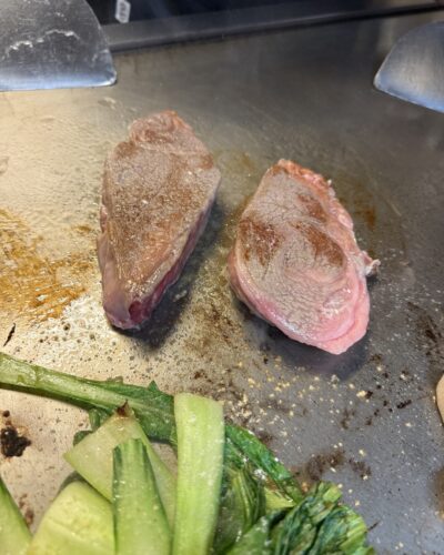 この時点で結構満足できていたのですがまださらに鉄板焼きが登場します。今度はヒレ!すげ~~~!さらに広島の福留ハムさんのソーセージなのかな?これがめちゃ美味しいそうです!