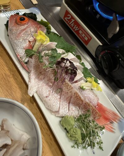 お鍋でぐつぐつ煮ている間にお刺身をいただきます!なんとのどぐろ!本当はアワビをいれる予定だったのですが時化で漁ができなかったということでかわりにのどぐろが!どっちもうれしいですよね~!かなり立派なのどぐろでした!いただいてみると甘みがしっかり感じられてとっても美味しい~!