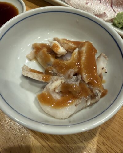 まずはアンコウの胃袋をいただきます。お味噌でいただきましたがゼラチン質でとっても美味しい~!臭みも全くないですね~!お酒にぴったり!