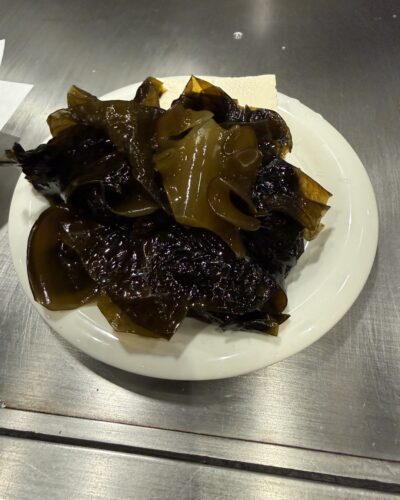 さらにとれたてのわかめを入れていきます。入れるとすごくきれいな緑色になります。このわかめが抜群に美味しいんですよね~!