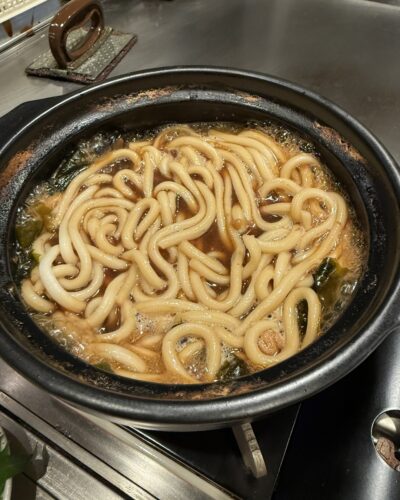 しっかりいただいて最後はうどんでしめます!たっぷり入れてしっかり味をしみこませていただきます。めっちゃ美味しい~!味噌煮込みうどん的な感じですね。あっという間に完食しちゃいました~!