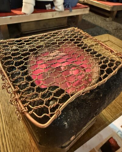 お肉しっかり入っていましたよ~!七輪の炭火で焼いていきます!