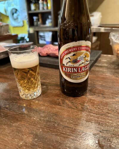 お店は元タコ焼き屋さんでした。お店はほぼほぼ同じで懐かしい感じがしました。まずは瓶ビールで乾杯です!