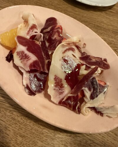 この日のメニューもとっても美味しそう!最初のお料理は生ハムと果物をお願いしました!まずは生ハムからいただきます!塩気がちょうどよくってとっても美味しい~!次に柑橘系の果物と一緒にいただきます!酸味と塩味のバランスが素晴らしいですね~!めっちゃ美味しい~!