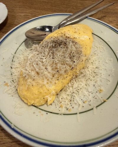 定番メニューともいうべきオムレツとパルミジャーノ!パルミジャーノたっぷりかかっています。とろっとろのオムレツと一緒にいただくとめっちゃ美味しい~!