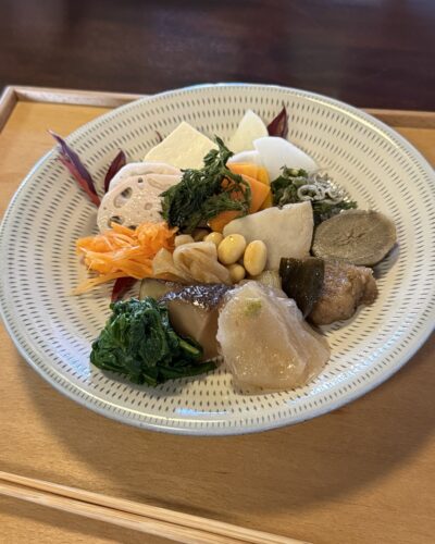 続いて近隣で獲れた新鮮なお野菜や特産のこんにゃくなどが登場しました!どれも優しい味付けで体が喜ぶのがわかりますね~!ほんととっても美味しい~!最高です!