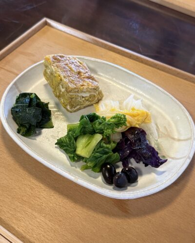 近所で平飼いされている鶏の卵で作った玉子焼きも素晴らしいです。昔ながらの風味がします!黒豆などのお野菜もほんと最高でした!