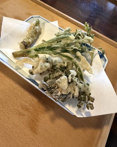 今度は山菜の蕎麦粉天ぷらが登場しました。蕎麦粉をつけてあるからなのかサクッとした食感がほんとたまらないんです。この山菜たちも周辺で朝とれたものばかりだそうです。