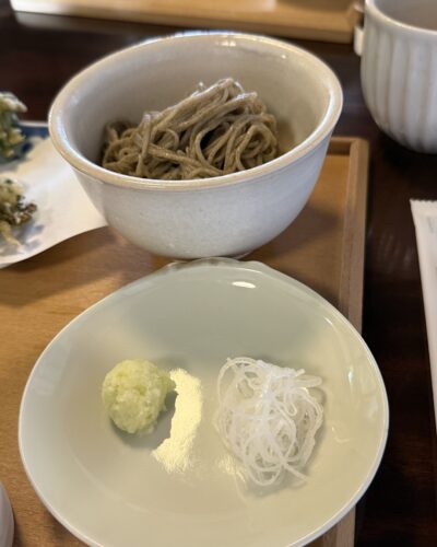 そして自家栽培でご自分で石臼でひいた蕎麦が登場します!一緒にねずみ大根もいただきます。こちらはかなり辛いのでお気を付けください。めっちゃ美味しい~!