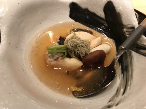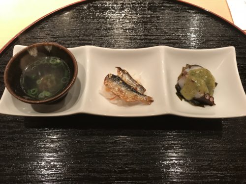ということでおすすめでメニューに載っていないものをいただくことに!結果ほとんどがメニュー外のお料理になっちゃいました!まずは先付から!鯛のお吸い物、ままかり、タコでした。ままかりってなかなかいただく機会がないです。たまたま大将が前日に岡山に行かれたそうです~!とってもおいしい~!